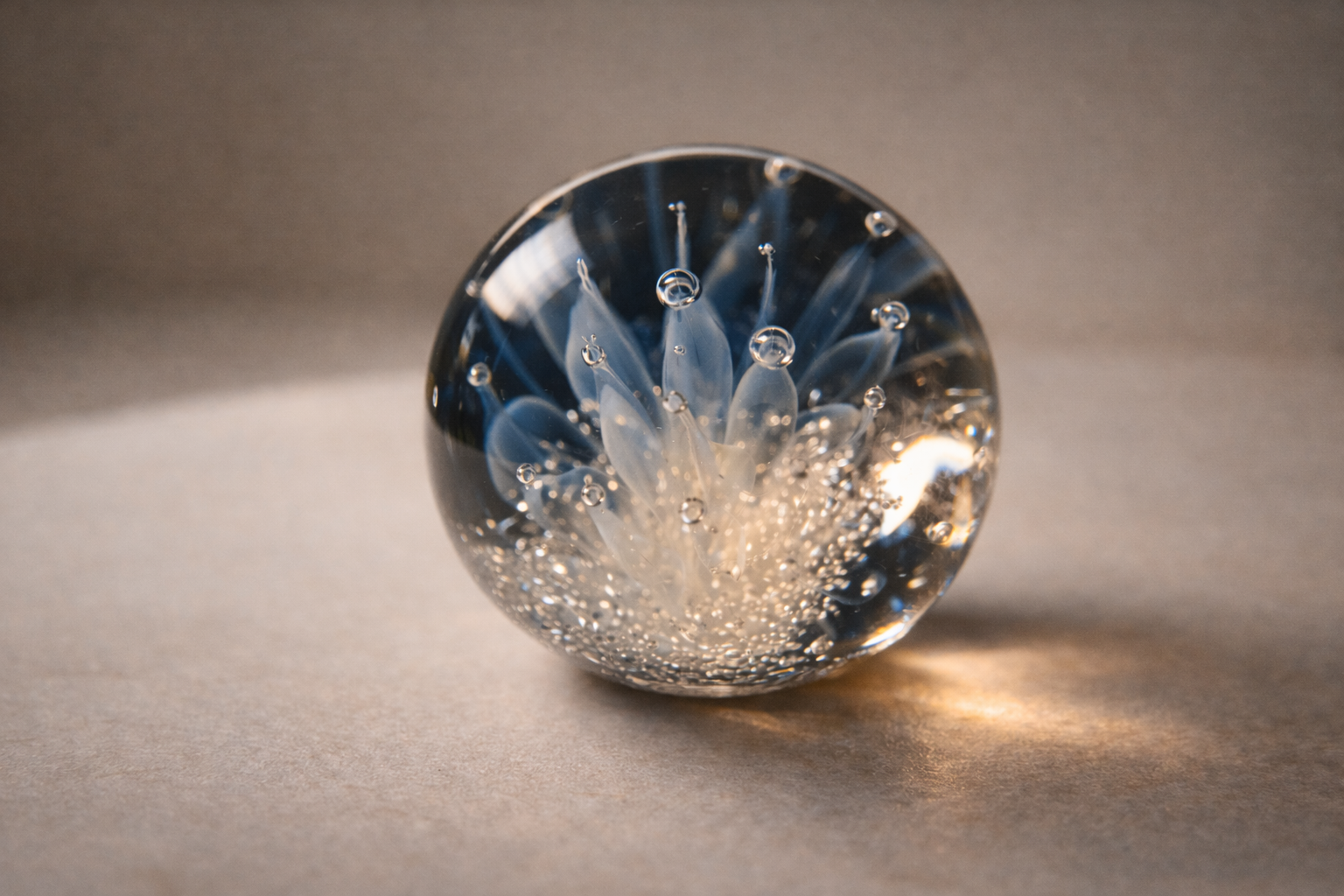 Sphère en verre borosilicate reposant sur une fine base de cendres.
